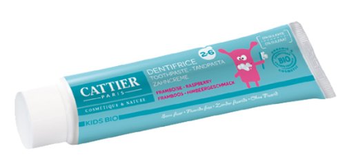 Lot de 2 tubes de 75 ml. le dentifrice Dentifrice enfants bio pour 2-6 ans Cattier Un dentifrice adapté aux dents de lait, sans fluor et au goût framboise,